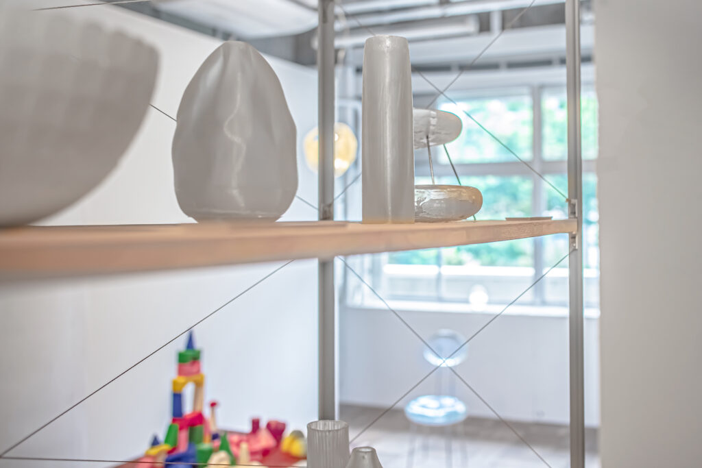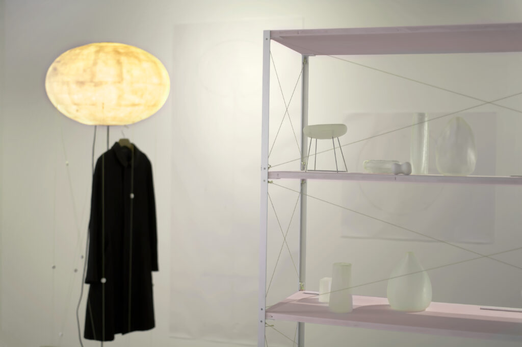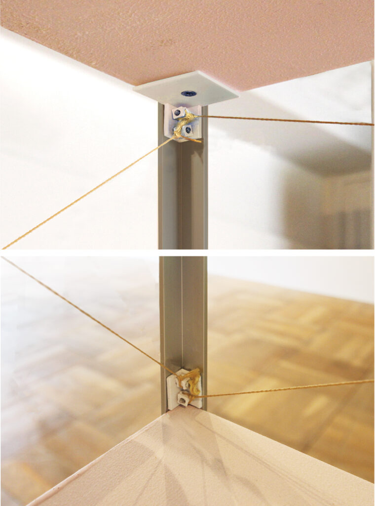 “棚”はアルミのアングルと木の板というありふれた材料を用い、寸法は住宅のドア枠等に合わせることで、住環境になじむように考えました。 細く軽い材料を用いながら市販の家具と同等の耐荷重を持たせるために十分な強度を持つケブラー糸を使用し、それらの接合部はミリ単位で設計、制作することで素材としてはチープでありながらも、空間の質を高めることができると考えています。