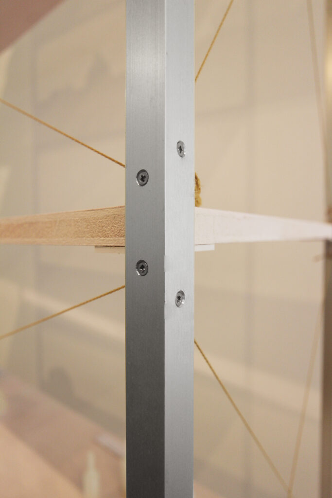 柱は比強度に優れたアルミのアングル材15x15x3を使用し、フラッシュの棚板で座屈を拘束しつつケブラー糸の斜材で安定化させている。総重量は10kgである。